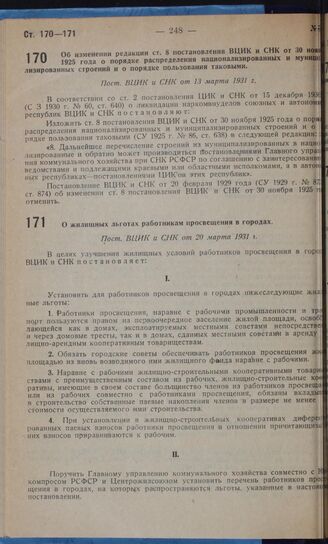 Об изменении редакции ст. 8 постановления ВЦИК и СНК от 30 ноября 1925 года о порядке распределения национализированных и муниципализированных строений и о порядке пользования таковыми.Пост. ВЦИК и СНК от 13 марта 1931 г.