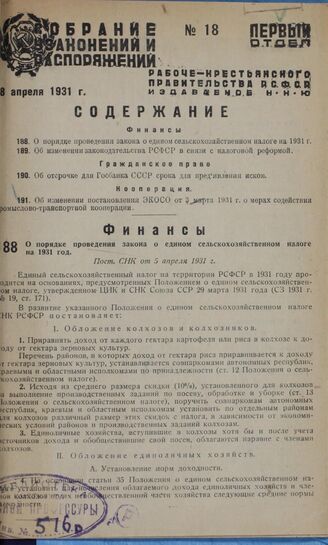 О порядке проведения закона о едином сельскохозяйственном налоге на 1931 год. Пост. СНК от 5 апреля 1931 г.