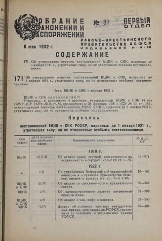 Главная Собрание законов и распоряжений правительства РСФСР и СССР Собрание законов и распоряжений Рабоче-Крестьянского Правительства ... Собрание узаконений и распоряжений Рабочего и Крестьянского правите... Собрание узаконений и распоряжений Рабоче-Крестьянского правительст... Документы Об утверждении перечня постановлений ВЦИК и СНК, изданных до 1 янва...