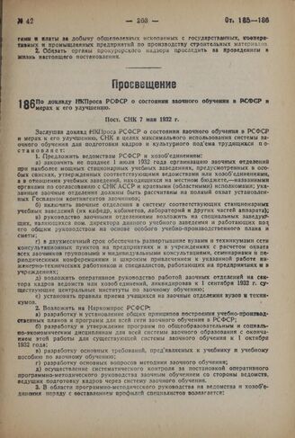 По докладу НКПроса РСФСР о состояния заочного обучения в РСФСР и мерах к его улучшению. Пост. СНК 7 мая 1932 г.