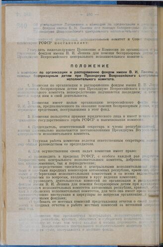 Постановление Всероссийского центрального исполнительного комитета и Совета народных комиссаров. Об утверждении Положения о Комиссии по организации и распоряжению фондом имени В.И. Ленина для помощи беспризорным детям при Президиуме Всероссийского...