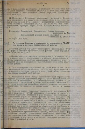 Постановление Совета народных комиссаров. По докладу Народного комиссариата просвещения РСФСР об изменении форм и методов просветительной работы. 28 апреля 1929 г.
