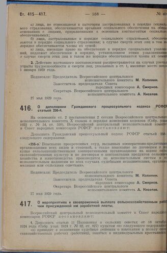 Постановление Всероссийского центрального исполнительного комитета и Совета народных комиссаров. О дополнении Гражданского процессуального кодекса РСФСР статьей 256-а. 27 мая 1929 г.