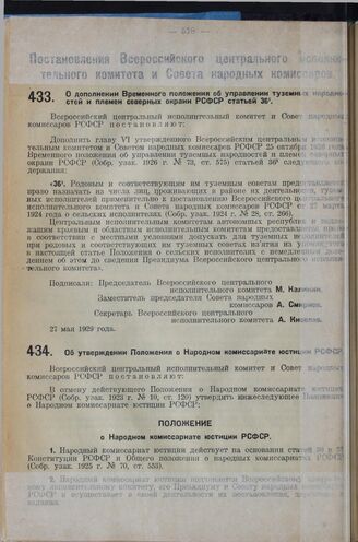 Постановление Всероссийского центрального исполнительного комитета и Совета народных комиссаров. Об утверждении Положения о Народном комиссариате юстиции РСФСР. 3 июня 1929 г.
