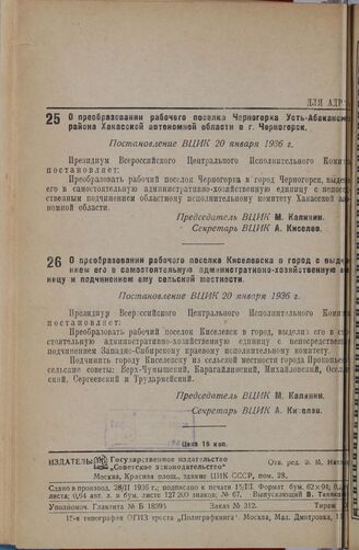 О преобразовании рабочего поселка Черногорка Усть-Абаканского района Хакасской автономной области в г. Черногорск. Постановление ВЦИК 20 января 1936 г.