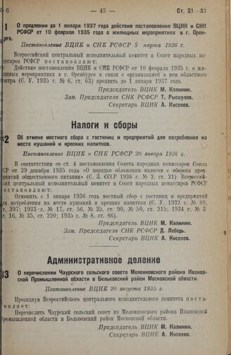 Об отмене местного сбора с гостиниц и предприятий для потребления на месте кушаний и крепких напитков. Постановление ВЦИК и СНК РСФСР 20 января 1936 г.