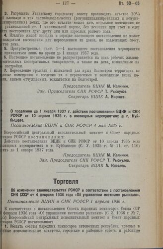 Об изменении законодательства РСФСР в соответствии с постановлением СНК СССР от 4 февраля 1936 г. «Об управлении местными рынками». Постановление ВЦИК и СНК РСФСР 1 апреля 1936 г.