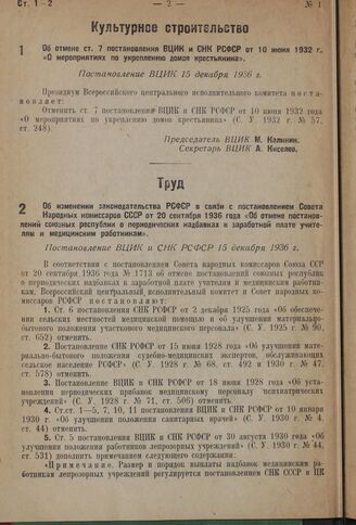 Об изменении законодательства РСФСР в связи с постановлением Совета Народных комиссаров СССР от 20 сентября 1936 года «Об отмене постановлений союзных республик о периодических надбавках к заработной плате учителям и медицинским работникам». Постановление ВЦИК и СНК РСФСР 15 декабря 1936 г.