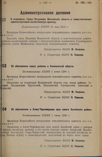 О выделении города Владимира Ивановской области в самостоятельную административно-хозяйственную единицу. Постановление ВЦИК 20 мая 1936 г.