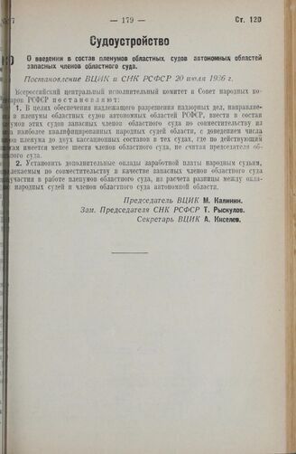 О введении в состав пленумов областных судов областей запасных членов областного суда. Постановление ВЦИК и СНК РСФСР 20 июля 1936 г.