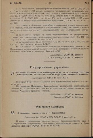 Об отмене постановления Президиума ВЦИК от 18 сентября 1924 года «О воспрещении свободного въезда на территорию Алданских приисков». Постановление ВЦИК 23 июня 1937 г.