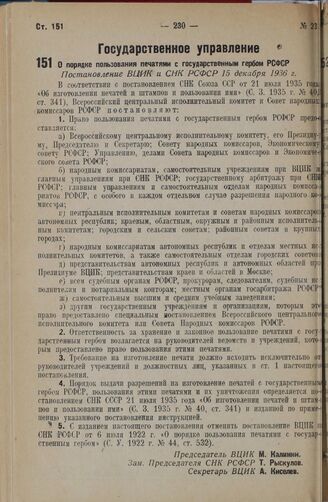 О порядке пользования печатями с государственным гербом РСФСР. Постановление ВЦИК и СНК РСФСР 15 декабря 1936 г.