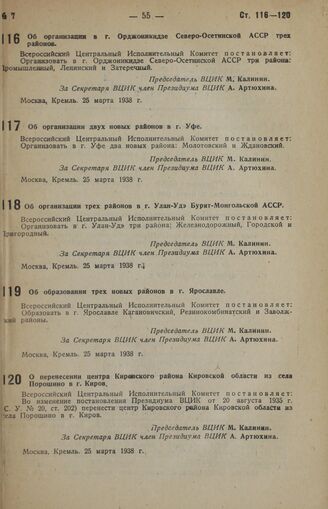 Постановление Всероссийского центрального исполнительного комитета. О перенесении центра Кировского района Кировской области из села Порошино в г. Киров. 25 марта 1938 г.