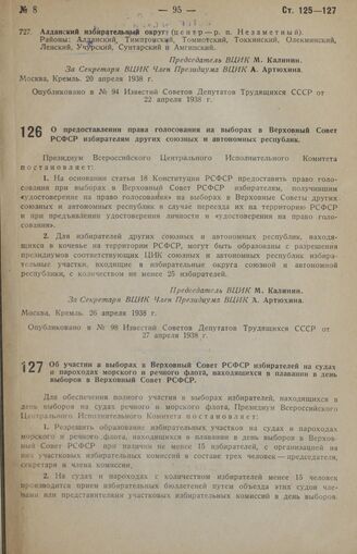 Постановление Президиума Всероссийского Центрального Исполнительного Комитета. О предоставлении права голосования на выборах в Верховный Совет РСФСР избирателям других союзных и автономных республик. 26 апреля 1938 г. // Опубликовано в № 98 Известий Советов Депутатов Трудящихся СССР от 27 апреля 1938 г.