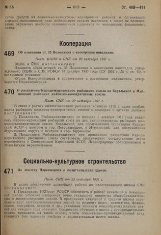 О разделении Карело-мурманского рыбацкого союза на Карельской и Мурманский рыбацкие колхозно-кооперативные союзы. Пост. СНК от 20 октября 1931 г.