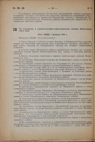 Об изменениях в административно-территориальном делении Нижне-волжского края. Пост. ВЦИК 1 февраля 1933 г.