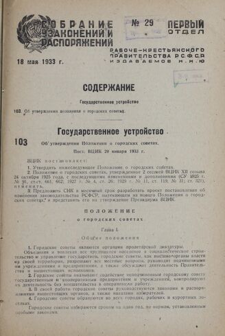 Об утверждении Положения о городских советах. Пост. ВЦИК 20 января 1933 г.
