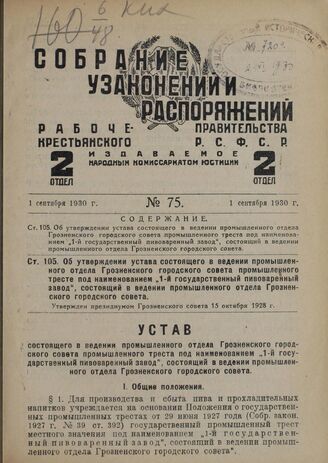 Об утверждении устава состоящего в ведении промышленного отдела Грозненского городского совета промышленного тресте под наименованием «1-й государственный пивоваренный завод», состоящий в ведении промышленного отдела Грозненского городского совета...