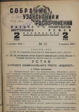 Об утверждении устава Курского коммунального треста «Водосвет». Утвержден Президиумом Курского горсовета 16 ноября 1929 г.