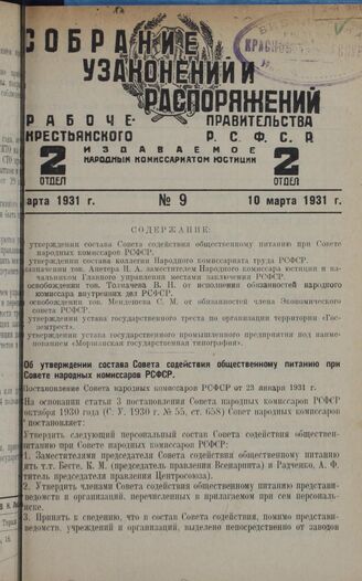 Об утверждении состава Совета содействия общественному питанию при Совете народных комиссаров РСФСР. Постановление Совета народных комиссаров РСФСР от 23 января 1931 г.