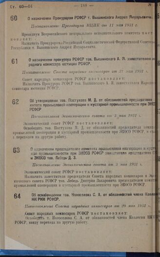 О назначении председателем комитета промысловой кооперации и кустарной промышленности при ЭКОСО РСФСР заместителя председателя СНК и ЭКОСО тов. Лебедь Д.З. Постановление Экономического совета от 3 мая 1931 г.