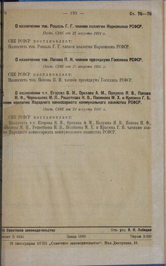 О назначении т.т. Егорова В.М., Орехова А.М., Полуяна Я.В., Попова Н.Ф., Чернышева М.П., Решеткова И.В., Полякова М.X. и Красина Г.Б. членами коллегии Народного комиссариата коммунального хозяйства РСФСР. Пост. СНК от 21 августа 1931 г.
