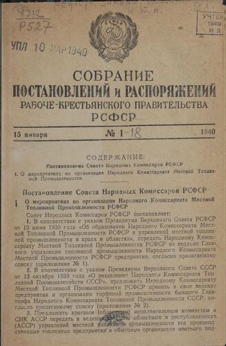 Постановление Совета Народных Комиссаров РСФСР. О мероприятиях по организации Народного Комиссариата Местной Топливной Промышленности РСФСР. 9 ноября 1939 г. № 643