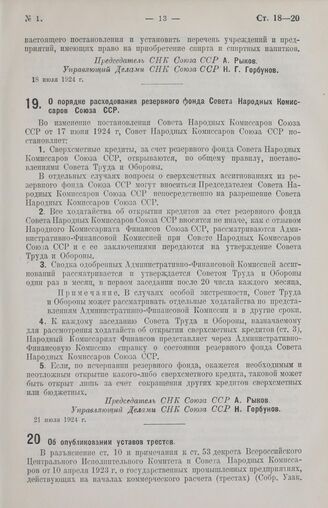 Постановление Совета Народных Комиссаров. О порядке расходования резервного фонда Совета Народных Комиссаров Союза ССР. 21 июля 1924 г.