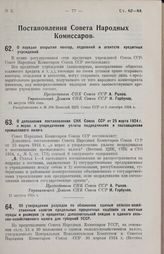 Постановление Совета Народных Комиссаров. О порядке открытия контор, отделений и агентств кредитных учреждений. 11 августа 1924 г. // Распубликовано в № 200 Известий ЦИК Союза ССР от 3 сентября 1924 г.