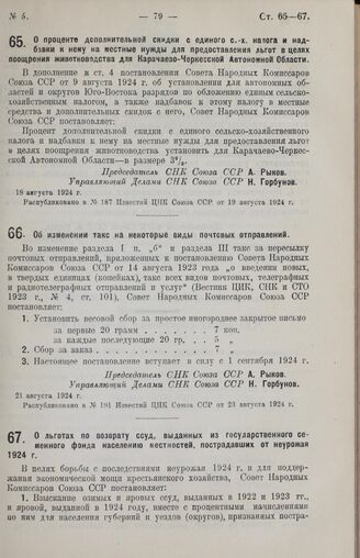 Постановление Совета Народных Комиссаров. О проценте дополнительной скидки с единого с.-х. налога и надбавки к нему на местные нужды для предоставления льгот в целях поощрения животноводства для Карачаево-Черкесской Автономной Области. 18 августа 1924 г.