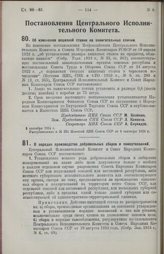 Постановление Центрального Исполнительного Комитета и Совета Народных Комиссаров Союза ССР. Об изменении акцизной ставки на зажигательные спички. 6 сентября 1924 г.