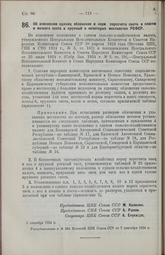 Постановление Центрального Исполнительного Комитета и Совета Народных Комиссаров Союза ССР. Об изменении единиц обложения и норм пересчета скота в пашню и мелкого скота в крупный в некоторых местностях РСФСР. 5 сентября 1924 г. // Распубликовано в № 204 Известий ЦИК Союза ССР от 7 сентября 1924 г.