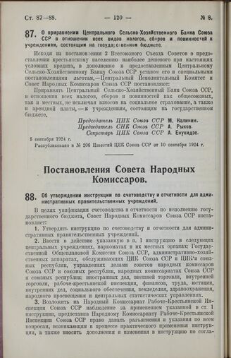 Постановление Совета Народных Комиссаров. Об утверждении инструкции по счетоводству и отчетности для административных правительственных учреждений. 21 августа 1924 г.