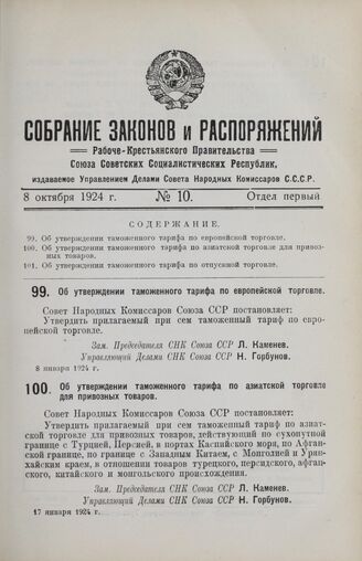 Постановление Совета Народных Комиссаров. Об утверждении таможенного тарифа по европейской торговле. 8 января 1924 г.