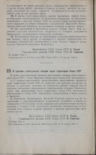 Постановление Совета Народных Комиссаров. О транзите иностранных товаров через территорию Союза ССР. 8 января 1925 г.