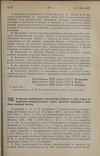 Постановление Центрального Исполнительного Комитета и Совета Народных Комиссаров Союза ССР. О порядке освобождения крестьянских хозяйств в черте города от подоходно-поимущественного налога, рентного обложения и некоторых местных налогов. 11 июля 1...