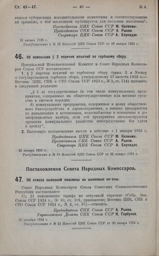 Постановление Президиума Центрального Исполнительного Комитета. Об изменении § 2 перечня изъятий по гербовому сбору. 16 января 1925 г. // Распубликовано в № 18 Известий ЦИК Союза ССР от 22 января 1925 г.