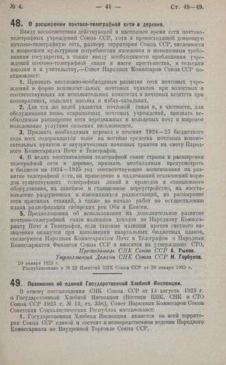 Постановление Совета Народных Комиссаров. О расширении почтово-телеграфной сети в деревне. 20 января 1925 г. // Распубликовано в № 22 Известий ЦИК Союза ССР от 28 января 1925 г.