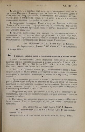 Постановление Совета Народных Комиссаров. О порядке выпуска марок с благотворительными и иными целями. 1 октября 1924 г. // Распубликовано в № 229 Известий ЦИК Союза ССР от 7 октября 1924 г.