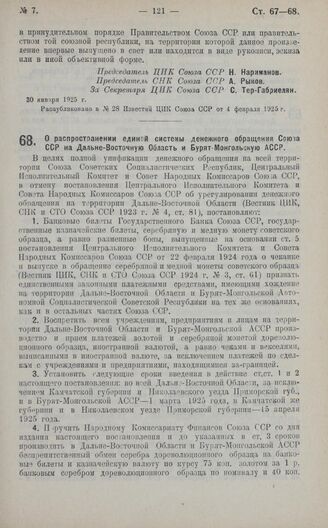 Постановление Президиума Центрального Исполнительного Комитета. О распространении единой системы денежного обращения Союза ССР на Дальне-Восточную Область и Бурят-Монгольскую АССР. 30 января 1925 г.