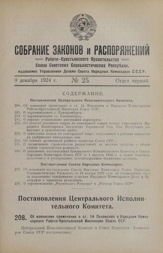 Постановление Центрального Исполнительного Комитета и Совета Народных Комиссаров Союза ССР. Об изменении примечания к ст. 14 Положения о Народном Комиссариате Рабоче-Крестьянской Инспекции Союза ССР. 14 ноября 1924 г.