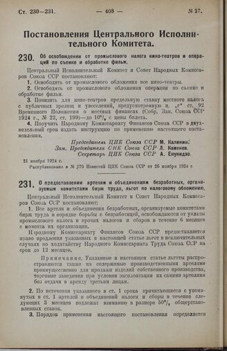 Постановление Центрального Исполнительного Комитета и Совета Народных Комиссаров Союза ССР. Об освобождении от промыслового налога кино-театров и операций по съемке и обработке фильм. 21 ноября 1924 г.