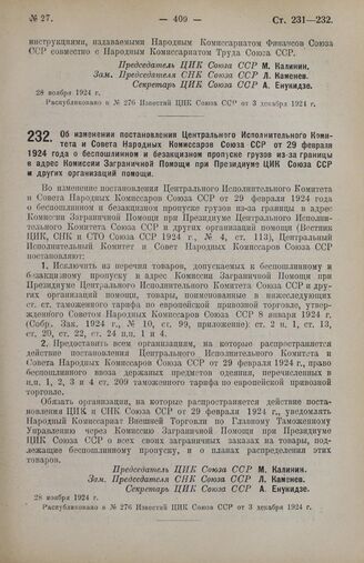 Постановление Центрального Исполнительного Комитета и Совета Народных Комиссаров Союза ССР. Об изменении постановления Центрального Исполнительного Комитета и Совета Народных Комиссаров Союза ССР от 29 февраля 1924 года о беспошлинном и безакцизном пропуске грузов из-за границы в адрес Комиссии Заграничной Помощи при Президиуме ЦИК Союза ССР и других организаций помощи. 28 ноября 1924 г.