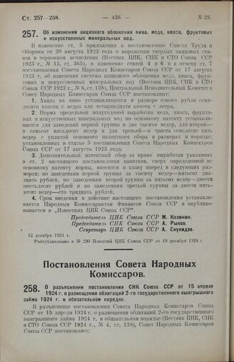 Постановление Центрального Исполнительного Комитета и Совета Народных Комиссаров Союза ССР. Об изменении акцизного обложения пива, меда, кваса, фруктовых и искусственных минеральных вод. 12 декабря 1924 г.