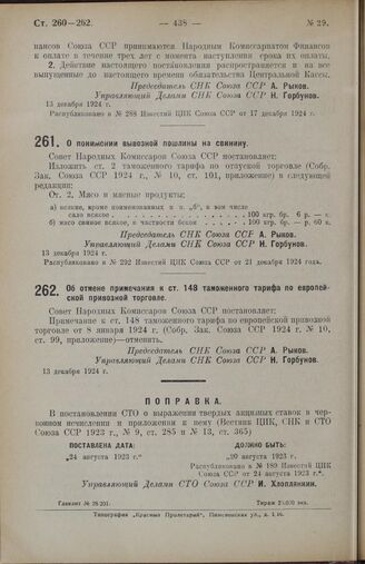 Постановление Совета Народных Комиссаров. О понижении вывозной пошлины на свинину. 13 декабря 1924 г. // Распубликовано в № 292 Известий ЦИК Союза ССР от 21 декабря 1924 г.
