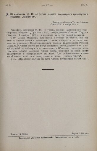 Главная Собрание законов и распоряжений правительства РСФСР и СССР Собрание законов и распоряжений Рабоче-Крестьянского Правительства ... Собрание законов и распоряжений Рабоче-Крестьянского Правительства ... Документы Об изменении §§ 40, 45 устава первого акционерного транспортного об...