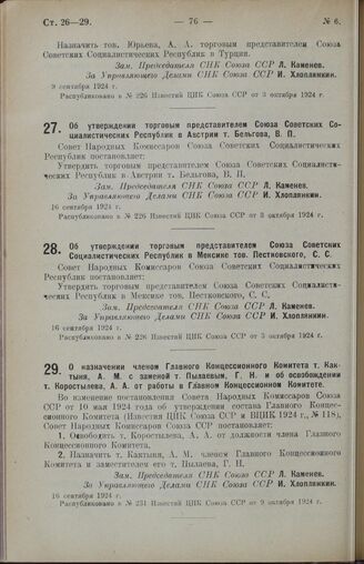 Постановление Совета Народных Комиссаров. Об утверждении торговым представителем Союза Советских Социалистических Республик в Мексике тов. Пестковского, С.С. 16 сентября 1924 г. // Распубликовано в № 226 Известий ЦИК Союза ССР от 3 октября 1924 г.