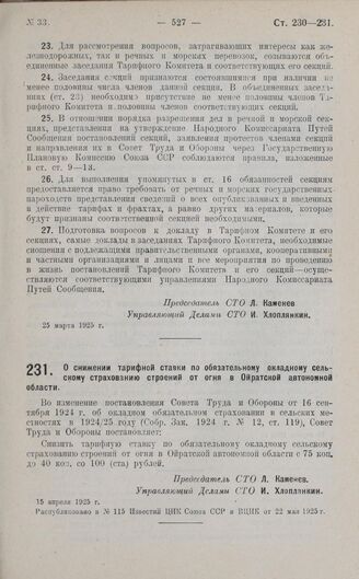 Постановление Совета Труда и Обороны. О снижении тарифной ставки по обязательному окладному сельскому страхованию строений от огня в Ойратской автономной области. 15 апреля 1925 г. // Распубликовано в № 115 Известий ЦИК Союза ССР и ВЦИК от 22 мая 1925 г.