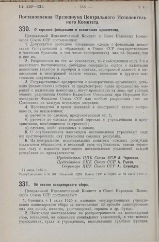 Постановление Президиума Центрального Исполнительного Комитета. О торговле фондовыми и валютными ценностями. 17 июля 1925 г.