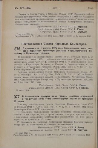 Постановление Совета Народных Комиссаров. О беспошлинном пропуске из-за границы почтовых отправлений в тех случаях, когда сумка причитающихся пошлин не превышает 25 копеек. 28 июля 1925 г.